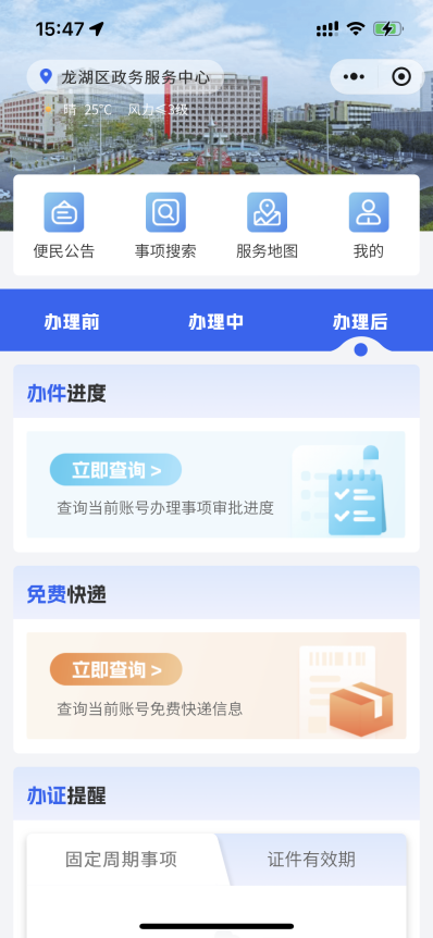 小程序主要分為“辦理前”、“辦理中”、“辦理后”三大版塊,“辦理前”版塊可查辦事指南、預(yù)約線下辦理、查找辦事大廳或自助終端地圖及可辦事項(xiàng)情況、查看大廳窗口實(shí)況和停車指引;“辦理中”版塊可查看大廳分布指引、查看叫號情況、排隊(duì)提醒、找?guī)娃k代辦、登記免費(fèi)打印復(fù)印服務(wù);“辦理后”版塊可查詢辦件進(jìn)度、查免費(fèi)快遞情況、證件到期提醒、辦事服務(wù)評價(jià)等。