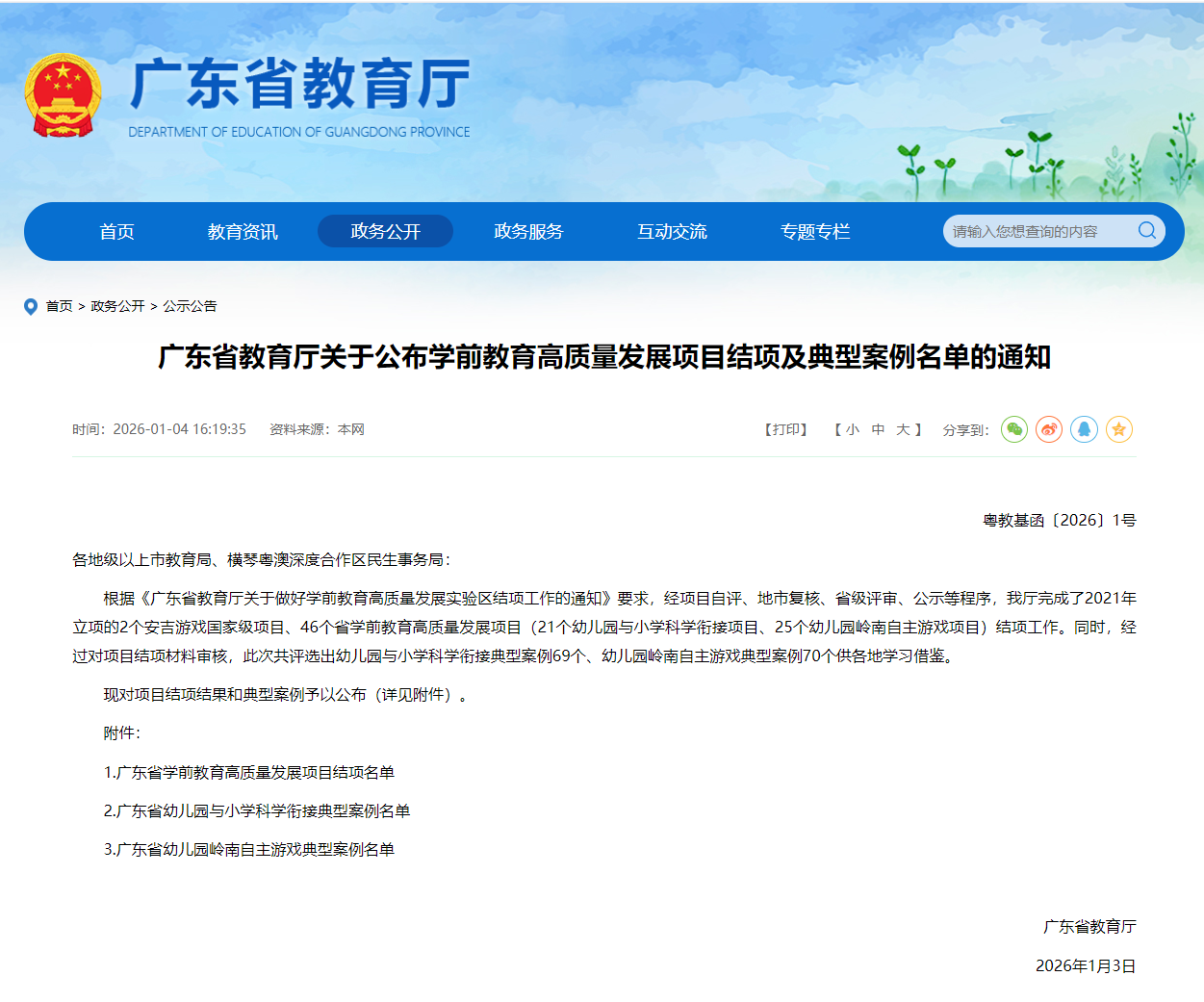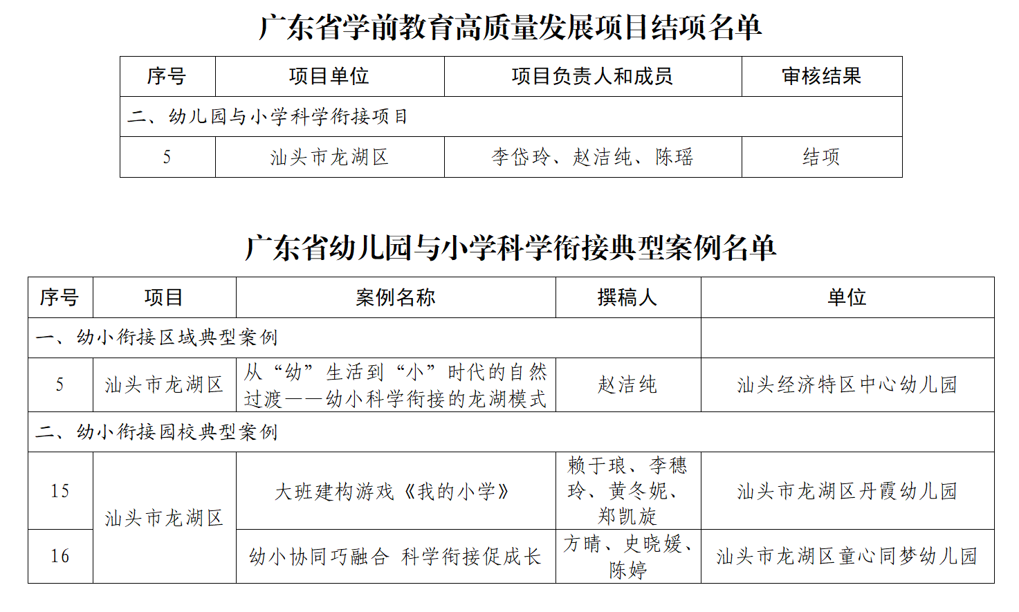近日,廣東省教育廳正式公布學前教育高質量發展項目結項及典型案例名單。由龍湖區承擔的“廣東省學前教育高質量發展實驗區——幼兒園與小學科學銜接項目”順利通過省級評審,成功結項;同時我區案例《從“幼”生活到“小”時代的自然過渡——幼小科學銜接的龍湖模式》入選“幼小銜接區域典型案例”,《大班建構游戲<我的小學>》《幼小協同巧融合 科學銜接促成長》入選“幼小銜接園校典型案例”