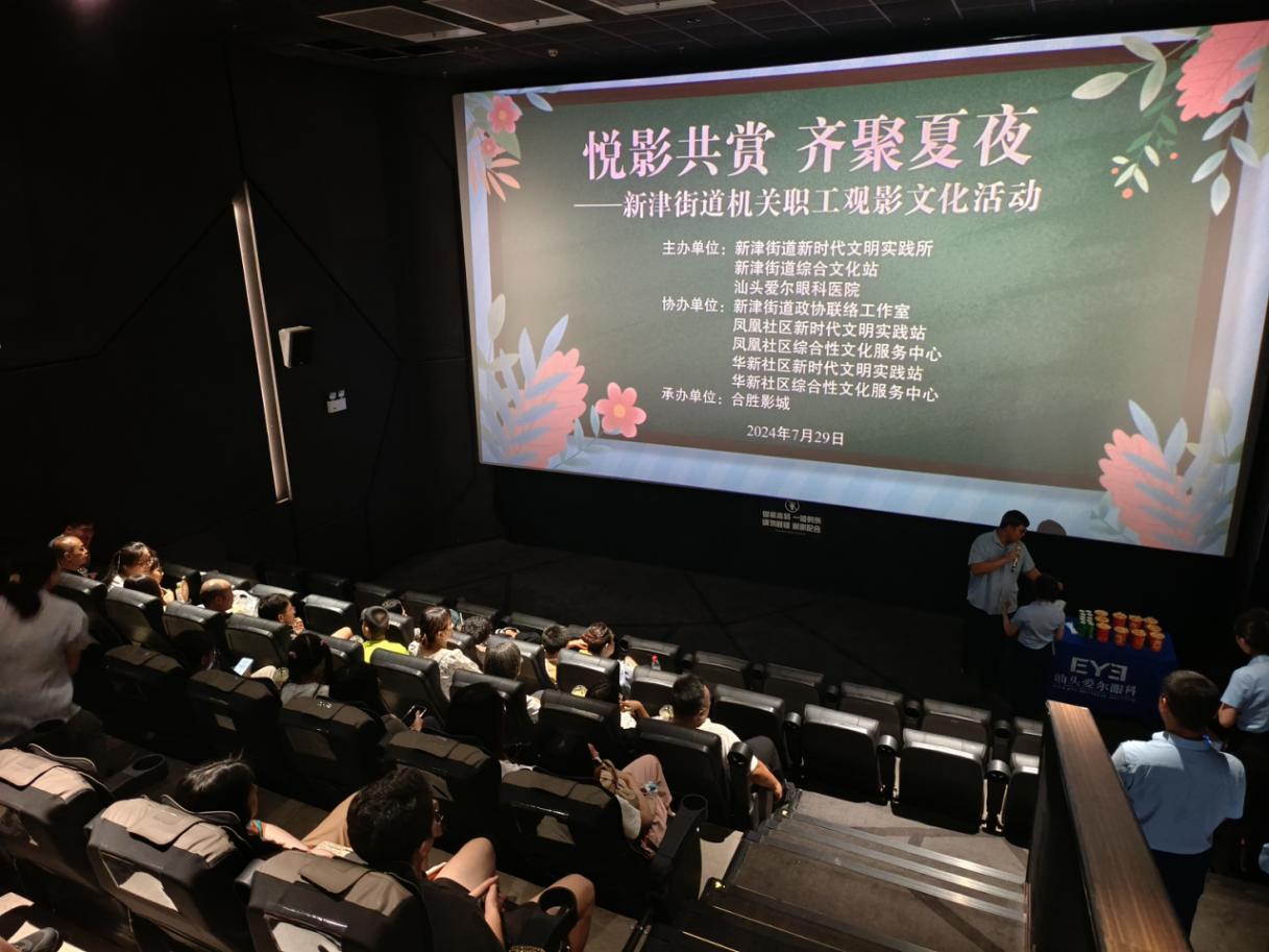 為進一步加強機關職工關心關愛工作,豐富職工及其子女的精神文化生活,增進職工與子女間的溝通交流和情感互動,7月29日晚上,新津街道新時代文明實踐所、街道綜合文化站聯合汕頭愛爾眼科醫院在泰安合勝廣場合勝影城開展“悅影共賞 齊聚夏夜”——新津街道機關職工觀影文化活動。活動吸引了約80名職工及職工子女參與。