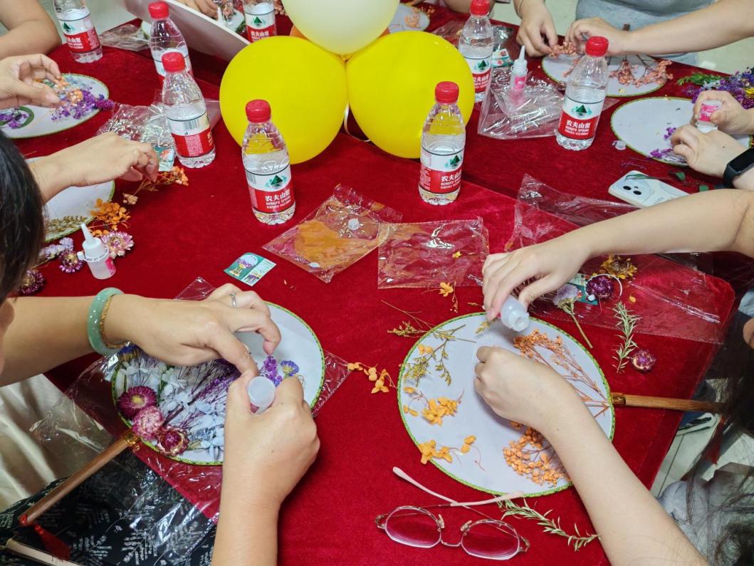 中秋雅韻,花語傳情。9月12日下午,香域水岸新時代文明實踐站承辦主題活動第二站永生花團扇DIY活動,活動邀請街道退休職工、各社區工會代表、社工代表、居民群眾等群體踴躍參與。永生花以其著艷麗的色澤與鮮活的姿態,寓意著對親情友情愛情的美好祝福;團扇又稱“合歡扇”,因團圓如月,象征著對闔家團圓的美好期盼。本場活動將色彩繽紛的永生花與古樸典雅的團扇相結合,充分展現出中華傳統文化獨特的優雅韻味。活動現場,志愿者首先從花材、造型、布局及配色等方面就團扇制作技巧進行了詳細講解,隨后大家宛如藝術家般精心構思,仔細挑選各類別永生花,在團扇上小心粘貼,逐步完成材料拼裝、固定,原本一面面素白的扇面漸漸被點綴,幻化為獨一無二的手工作品。在此過程中,大家充分發揮自身創意與想象力,分享交流彼此獨特的審美見解,感受傳統技藝深厚的文化底蘊,共享中秋佳節美好時光。