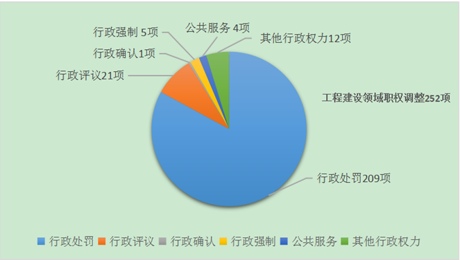 ?。ㄋ模└奖怼渡穷^市龍湖區人民政府關于調整由街道實施的區級行政職權通用目錄(工程建設領域)》,共收集梳理工程建設領域各職能部門的調整職權252項,其中涉及城管、住建、自然資源3個職能部門;共有行政處罰209項、行政許可21項、行政確認1項、行政強制5項、其他行政權力12項、公共服務4項。