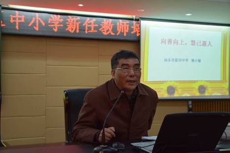 五位名校長名教師先后登臺開講,分別是:姚小敏校長的《向善向上,慧己惠人》,李長誠老師的《新教師怎樣聽課、評課》,蔡素純老師的《信息技術在教學中的有效應用》,莫劫主任的《用愛心架起師生交流的橋梁》,陳少娜主任的《名師講堂》。導師們言傳身教,把他們先進的教育教學理論和豐富的教學經驗傳授給新教師,給新任教師們上了生動有趣而又富有實效性的一課