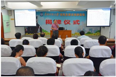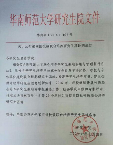 在授牌儀式上,華南師范大學(xué)研究生院常務(wù)副院長肖鵬教授宣讀了華南師范大學(xué)研究生院文件《關(guān)于公布第四批校級聯(lián)合培養(yǎng)研究生基地的通知》,并介紹了攜手龍湖區(qū)教育局在林百欣中學(xué)設(shè)立培養(yǎng)基地的背景原因和現(xiàn)實意義,他指出,汕頭經(jīng)濟(jì)特區(qū)林百欣中學(xué)成為“華南師范大學(xué)校級聯(lián)合培養(yǎng)研究生基地”將對促進(jìn)區(qū)域內(nèi)高級中學(xué)師資的專業(yè)發(fā)展及提升教育科研質(zhì)量產(chǎn)生積極的作用; 數(shù)學(xué)科學(xué)學(xué)院黨委書記江樂忠同志介紹了該院數(shù)學(xué)學(xué)科高端的科學(xué)研究水平,以及近年來在人才培養(yǎng)方面取得的卓越成就,他希望,借助“華南師范大學(xué)校級聯(lián)合培養(yǎng)研究生基地”這個平臺,華師大能為龍湖教育做更多事情,培養(yǎng)更多人才;區(qū)政府孫健文副區(qū)長對華南師范大學(xué)研究生學(xué)院關(guān)心基礎(chǔ)教育、支持龍湖教育發(fā)展的行為表示了崇高的敬意。他表示:華南師范大學(xué)作為華南地區(qū)教師教育的“龍頭”,南方教育的引領(lǐng)者,將研究生聯(lián)合培養(yǎng)基地落戶龍湖,這是華師對龍湖教育的關(guān)心與厚愛、信任與支持,是龍湖教育事業(yè)的一件喜事,我們將以基地建成為契機(jī),不斷加強(qiáng)與華南師范大學(xué)在師資培養(yǎng)、課程改革、科研項目合作、研究生培養(yǎng)管理與經(jīng)驗交流等方面合作。隨后,華南師范大學(xué)研究生院常務(wù)副院長肖鵬教授向林百欣中學(xué)沈初生校長授牌,“華南師范大學(xué)校級聯(lián)合培養(yǎng)研究生基地”正式宣告落戶林百欣中學(xué)。