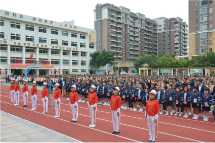 早上8點半,香港寶覺小學的師生乘坐大巴抵達金陽小學教育集團總校,受到全校師生的熱烈歡迎,隨后在操場舉行了升旗儀式。莊嚴的國歌聲中,校園里五星紅旗冉冉升起,同學們注視國旗,高唱國歌,全場莊嚴肅穆。