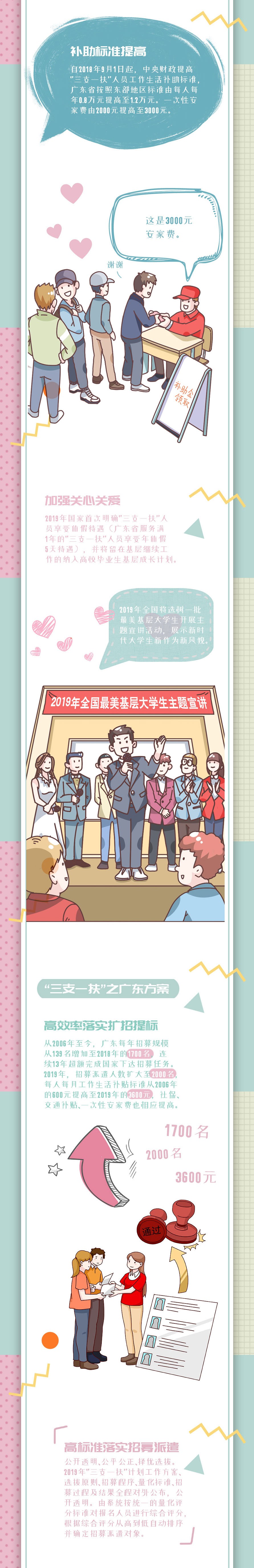 今年我省計劃招募2000名高校畢業生服務基層,招募人數比2018年增加300人,將按照公開招募、自愿報名、量化測評、公平選拔、統一派遣的方式,將志愿者們派遣到粵東粵西粵北經濟欠發達地區的農村基層從事支教、支農(水利)、支醫、扶貧工作,服務期2年。