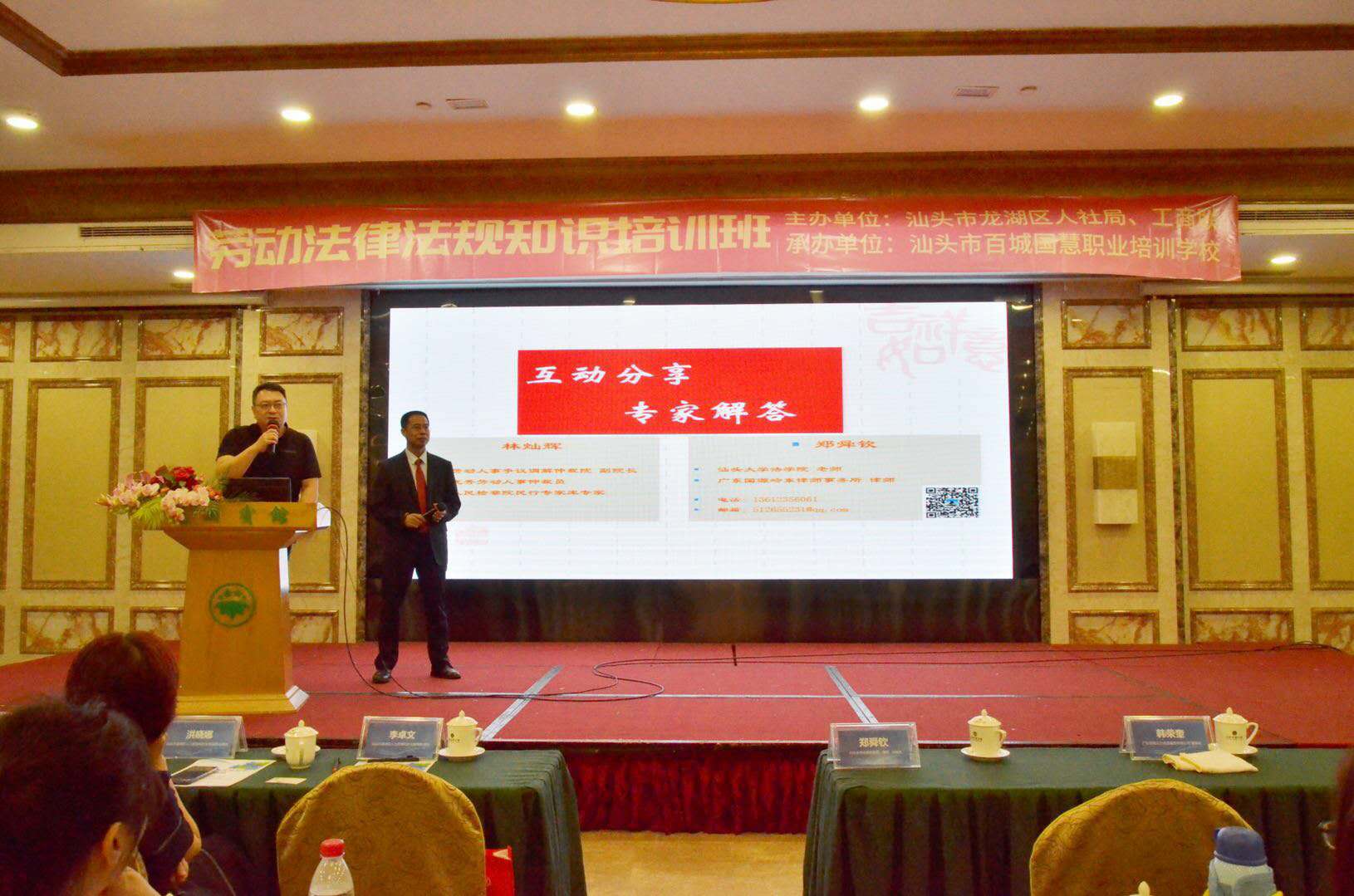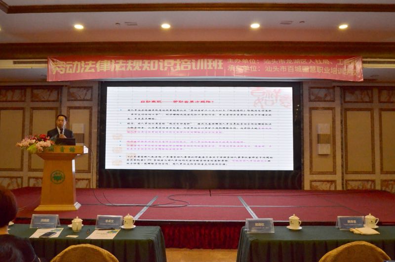 法律的生命在于實施,法律的權威在于實施。為進一步幫助我區用人單位提高勞動法律法規意識,更好的掌握勞動法律法規知識,掌握依法管理的方法和工作流程。懂法、守法、用法,掌握預防勞動用工法律風險的知識與技能,共同營造企業誠信經營,勞動者誠實勞動的良好用工氛圍,構建既規范有序又公正合理的和諧勞動關系,減少勞資糾紛,由區人社局、區工商聯主辦,汕頭百城國慧職業培訓學校協辦的公益型勞動法律法規知識培訓班于5月20日下午在汕頭市花園賓館開班。超過200多名企業經營者和HR參加培訓。區人社局李卓文局長及洪曉娜副局長到場參加培訓活動。李卓文局長作開班動員講話,他希望,用人單位要從當好社會主義法治的忠實崇尚者,自覺遵守者,堅定捍衛者的高度認識培訓活動的意義。通過培訓,提高勞動保障法律意識,造就更多人力資源法律人才,為企業規范發展提供強有力的法律保障,要求在推進科技創新、管理創新中,要把依法治理真正融入到企業管理中,通過法律的貫徹實施來構建和諧穩定的勞動關系。?