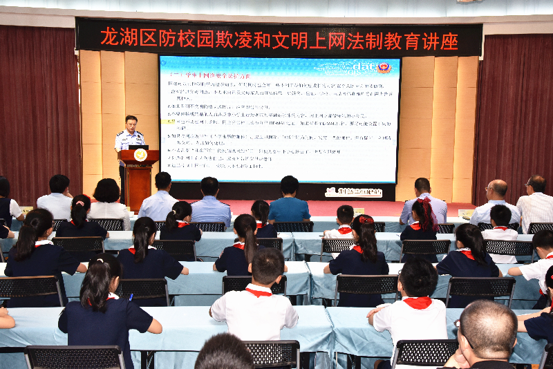 7月3日上午,龍湖區(qū)教育局和龍湖公安分局、汕頭市網(wǎng)警支隊(duì)聯(lián)合舉辦“龍湖區(qū)中小學(xué)防校園欺凌和文明上網(wǎng)法制教育講座”。本次活動主會場設(shè)在金陽小學(xué),區(qū)內(nèi)其他公、民辦中小學(xué)近十萬師生則以班級為單位設(shè)分會場,通過“云直播”同步收看聆聽了講座。