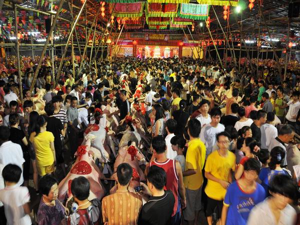 二是借助盛會(huì)契機(jī)推進(jìn)文明建設(shè)、繁榮鄉(xiāng)村文化。龍美社區(qū)歷來(lái)重視文明建設(shè),曾獲廣東省六好平安和諧社區(qū)、汕頭市文明社區(qū)等稱(chēng)號(hào)。在組織這次十年盛會(huì)的過(guò)程中,社區(qū)居委注意挖掘民俗活動(dòng)的積極因素,推進(jìn)文明建設(shè)、繁榮鄉(xiāng)村文化。一方面是引導(dǎo)村民認(rèn)識(shí)紀(jì)念祭祀福圣公媽活動(dòng)的意義。中元節(jié)在潮汕地區(qū)俗稱(chēng)“鬼節(jié)”,潮汕各地普遍有大辦施孤的習(xí)俗。而鷗汀街道漁洲片的中元節(jié)祭拜習(xí)俗卻有著特別的紀(jì)念意義。傳說(shuō)宋朝年間,有一位將軍帶兵到漁洲平亂受困全軍覆沒(méi),將軍犧牲后葬于漁洲,俗稱(chēng)老公陵。漁洲陵百姓為了紀(jì)念這位將軍平亂治世,感其恩德,為其立碑建廟,碑刻“福圣公媽”四字,定農(nóng)歷七月十五為福圣公媽圣誕日慶祭,由漁洲五鄉(xiāng)六社輪流祭祀,并舉行賽大豬、文藝游行、做大戲、紙影戲等文藝活動(dòng),逐漸形成了漁洲陵特有的賽會(huì)民俗。龍美社區(qū)注重對(duì)紀(jì)念活動(dòng)的引導(dǎo),力促去除迷信色彩。在本次盛會(huì)期間,專(zhuān)門(mén)舉辦了民俗淵源攝影展,使村民尤其是年輕一代更好地理解漁洲陵祭拜風(fēng)俗的由來(lái),強(qiáng)化紀(jì)念先人、傳承美德的意義。另一方面是把賽會(huì)辦成鄉(xiāng)村文化節(jié)。本次盛會(huì)舉行了一系列豐富的活動(dòng)。8月13日晚在文化廣場(chǎng)舉辦的“賽大豬”活動(dòng)最為熱鬧,240多頭全豬,大的凈重達(dá)600多斤,小的也有300多斤,羊150多只,還有“甜粿”、“鵝”等琳瑯滿目的祭祀品,場(chǎng)面尤為壯觀,人們用獨(dú)特的方式表達(dá)對(duì)美好生活的祈福。主辦方除了組織賽大豬等傳統(tǒng)祭祀項(xiàng)目外,著重強(qiáng)化賽會(huì)活動(dòng)的文化內(nèi)涵。社區(qū)連續(xù)4天組織演出潮劇大戲,還比往屆活動(dòng)新增了攝影展、花燈展,專(zhuān)門(mén)開(kāi)辟近200平方米的花燈展區(qū),展出了潮劇經(jīng)典劇目花燈、農(nóng)家民俗風(fēng)情花燈,還有傳統(tǒng)美德教育內(nèi)容的花燈。夜晚燈市燈光閃爍、會(huì)活動(dòng)的“人物”栩栩如生,吸引了社區(qū)及臨近村民帶著小孩來(lái)觀看。在社區(qū)老人活動(dòng)室頤園院內(nèi)的小池上還布置了“鯉魚(yú)躍龍門(mén)”和“雙龍戲水”等景觀,整個(gè)社區(qū)文化氣息濃厚。為營(yíng)造盛會(huì)的喜慶氣氛,社區(qū)購(gòu)置一批樂(lè)器,發(fā)動(dòng)村民自發(fā)組建潮汕大鑼鼓隊(duì)、潮樂(lè)隊(duì)等,經(jīng)過(guò)近一年的訓(xùn)練,社區(qū)這支業(yè)余文藝隊(duì)伍得到了發(fā)展壯大,在本次盛會(huì)文藝游行活動(dòng)中展現(xiàn)了風(fēng)采。