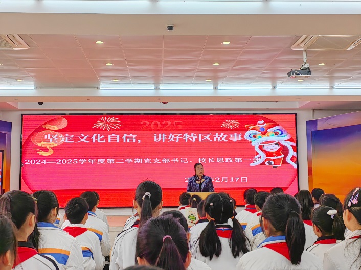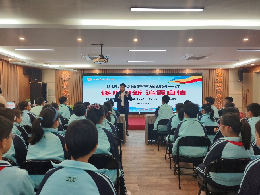 學校黨支部書記、校長紀勝輝以“逐丹日新”“追霞自信”“丹心向黨”三個關鍵詞為全校師生帶來開學思政第一課,鼓勵同學們積極參與校園活動,從“小問號大思考”“小老師大成長”“小課題大學問”等活動中學習新知識、掌握新技能,像Deepseek一樣深度思考,勇于嘗試,敢于創新,每天進步一點點;從電影《哪吒之魔童鬧海》中汲取力量,堅持文化自信,傳承和發揚潮汕優秀傳統文化;像黃旭華院士一樣為祖國作貢獻,用一顆赤誠的愛國之心服務家鄉,服務社會,報效祖國。(陳曉洵)