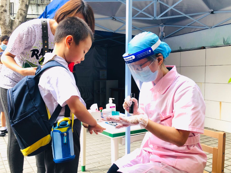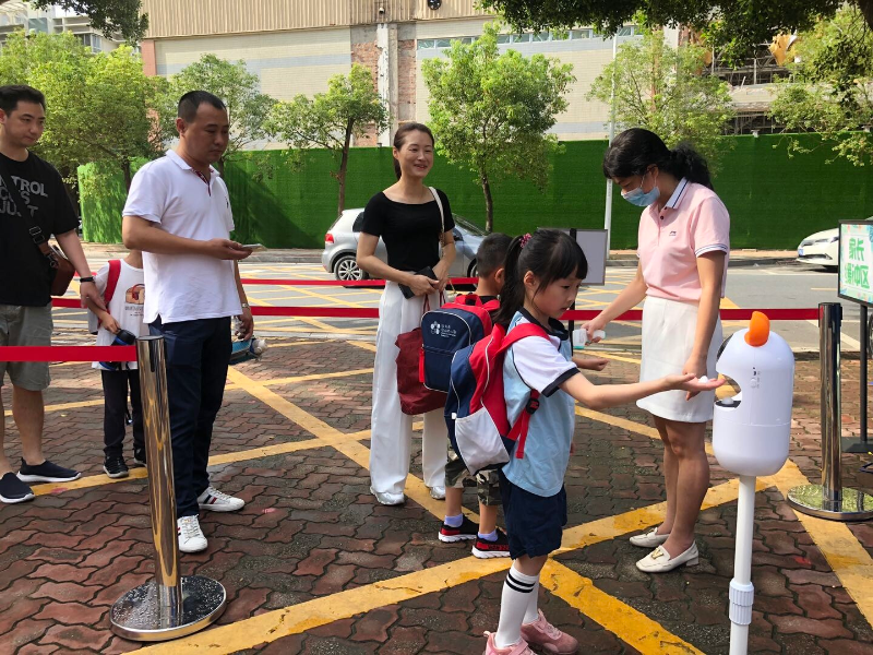 上午8:30開始,孩子們分批分時段在家長的陪同下來到幼兒園大門口。各園門口秩序井然,幼兒園教職員工和公安交警部門等工作人員全部到位,各司其職。為了保證每一個幼兒的健康,各園均實行錯時錯峰入園離園,幼兒園封閉管理,家長不進入園區。幼兒由家長帶領在幼兒園門口劃線處排隊,依次進入園內,進行鞋底消毒、測量體溫、檢查口腔、洗手消毒等工作。
