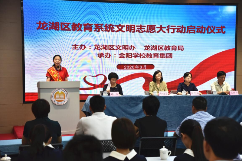 8月17日上午,由龍湖區文明辦、區教育局主辦,金陽學校教育集團協辦的龍湖區教育系統文明志愿服務大行動啟動儀式在龍泰小學舉行。區委常委、宣傳部部長鄭曉潔,區委宣傳部副部長芮玩燕,各街道創文工作分管領導,區教育局班子成員,區教師發展中心主任,局創文辦,外砂、新溪教育指導組負責人,各教育集團總校(園)長、各校配合街道文明志愿大行動聯絡人和志愿者代表共百余人參加了啟動儀式。