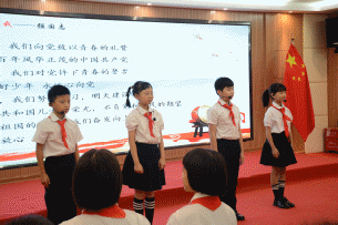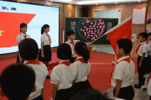 中隊(duì)長(zhǎng)宣布出隊(duì)旗,執(zhí)旗隊(duì)員手執(zhí)鮮艷的隊(duì)旗,在兩名護(hù)旗手的陪同下,邁著整齊的步伐進(jìn)入會(huì)場(chǎng)。全體少先隊(duì)員凝視隊(duì)旗,和著激越的旋律,唱出嘹亮的隊(duì)歌,全場(chǎng)洋溢著熱烈昂揚(yáng)的氣氛。