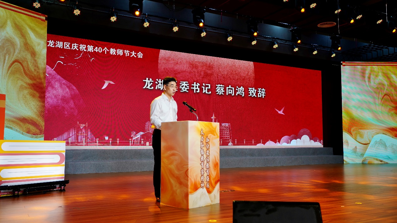 龍湖區委書記蔡向鴻代表區委、區政府向全區廣大教師、教育工作者致以節日的問候和美好的祝愿。他指出,龍湖區的教育資源、師資隊伍、辦學水平在全市乃至粵東走在前列、有目共睹,取得的成績離不開廣大教師和教育工作者的無私奉獻,他們始終同黨和人民站在一起,以赤誠之心、奉獻之心、仁愛之心投身教育事業,為龍湖經濟社會發展作出了突出貢獻。