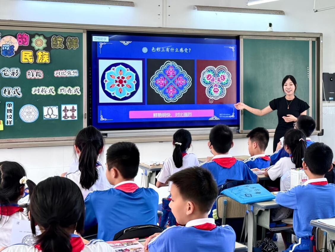 習(xí)性助學(xué)的“習(xí)性”二字,應(yīng)用在美術(shù)教學(xué)中,是按照學(xué)生的特點(diǎn)和需要,課中不斷提高學(xué)生的學(xué)習(xí)興趣和主動(dòng)參與意識(shí),從而促進(jìn)學(xué)生學(xué)習(xí)方式的轉(zhuǎn)變。學(xué)生習(xí)性主要有:主動(dòng)學(xué)習(xí)的習(xí)性、合作探究的習(xí)性、互動(dòng)參與的習(xí)性、表現(xiàn)自主的習(xí)性等。美術(shù)課程是一門(mén)以美術(shù)知識(shí)與技能為載體,注重學(xué)生的實(shí)踐操作:在課程中,需要給予學(xué)生足夠的實(shí)踐時(shí)間和指導(dǎo),幫助他們掌握繪畫(huà)技巧和方法,學(xué)生在輕松愉快的氛圍中培養(yǎng)審美能力和提高人文素養(yǎng)的綜合性課程。《多彩的民族紋樣》基于學(xué)生學(xué)習(xí)需要和美術(shù)學(xué)科特點(diǎn),將“教”與“學(xué)”融為一體,實(shí)現(xiàn)了美術(shù)學(xué)科核心素養(yǎng)在課堂中的有效落實(shí),促進(jìn)了學(xué)生在愉悅、自主的氛圍中學(xué)習(xí)美術(shù)知識(shí)與技能。五年級(jí)學(xué)生有一定美術(shù)知識(shí)量,需要運(yùn)用曾宇寧校長(zhǎng)所強(qiáng)調(diào)的“麥拉賓法則”,即通過(guò)肢體語(yǔ)言與學(xué)生互動(dòng),激發(fā)學(xué)生積極回答問(wèn)題的欲望。這一課通過(guò)學(xué)習(xí)任務(wù)單的方式層層遞進(jìn),讓學(xué)生像闖關(guān)一樣掌握本節(jié)課的重難點(diǎn),從而從課堂中獲得成就感。