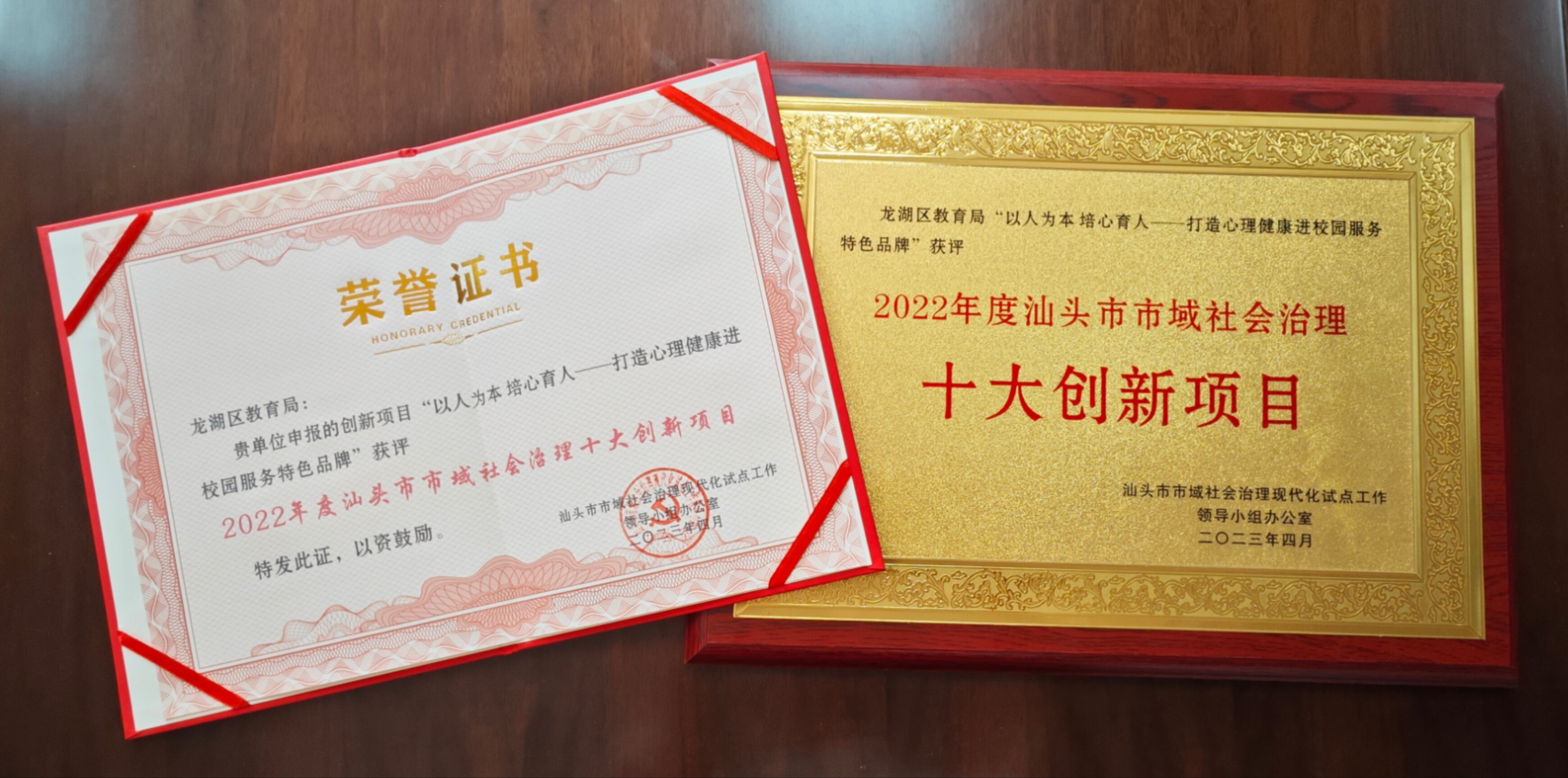2022年7月,汕頭市啟動2022年度汕頭市市域社會治理十大創新項目評選活動,經過項目初評、集中展示、網上投票、專家評審等環節,龍湖區教育局“以人為本培心育人-龍湖區精心打造心理健康進校園服務特色品牌”項目榮獲汕頭市市域社會治理十大創新項目!