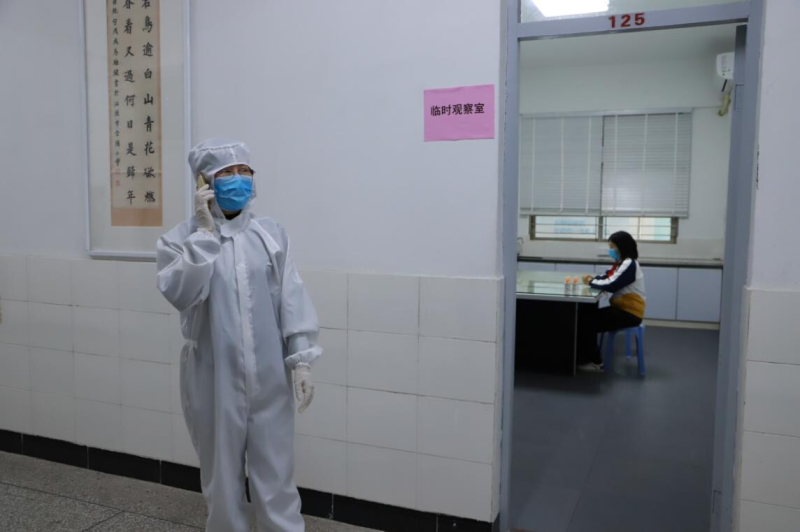 演練中,發(fā)現(xiàn)1名“學(xué)生”有發(fā)熱情況,值班行政迅速將其帶到空曠地再次檢測(cè)體溫,經(jīng)再次確認(rèn)發(fā)熱后,啟動(dòng)應(yīng)急預(yù)案,帶至臨時(shí)留觀室進(jìn)一步檢測(cè),詢問(wèn)該“學(xué)生”相關(guān)情況及近期活動(dòng)軌跡等,并記錄相關(guān)數(shù)據(jù),分級(jí)上報(bào)、通知家長(zhǎng)、送醫(yī)治療,人員離開(kāi)后進(jìn)行噴藥消毒……