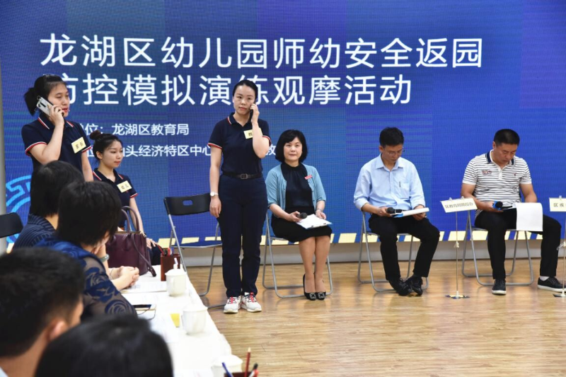 按照《廣東省教育廳關于開展全省學校學生返校疫情防控模擬演練的通知》要求,龍湖區先后于4月16日和26日組織開展了多場次、多層面的疫情防控模擬演練,切實提高全區中小學、中職學校師生返校疫情防控和遭遇突發狀況的應急處置能力,保障師生安全。當天上午舉行的幼兒園師幼返園防控模擬演練活動以“現場演練+桌面推演”形式進行呈現。