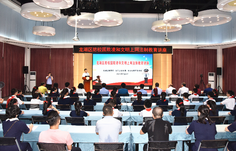 7月3日上午,龍湖區教育局和龍湖公安分局、汕頭市網警支隊聯合舉辦“龍湖區中小學防校園欺凌和文明上網法制教育講座”。本次活動主會場設在金陽小學,區內其他公、民辦中小學近十萬師生則以班級為單位設分會場,通過“云直播”同步收看聆聽了講座。