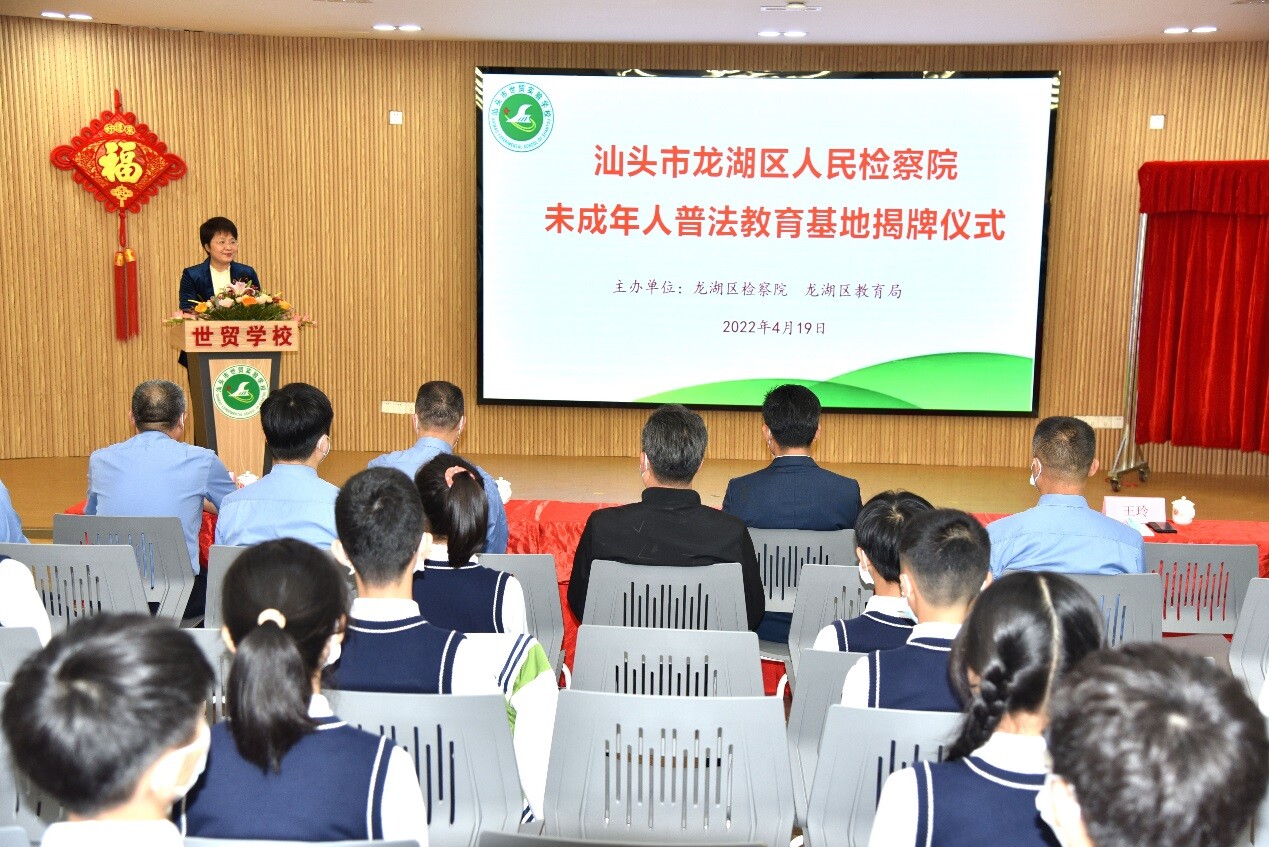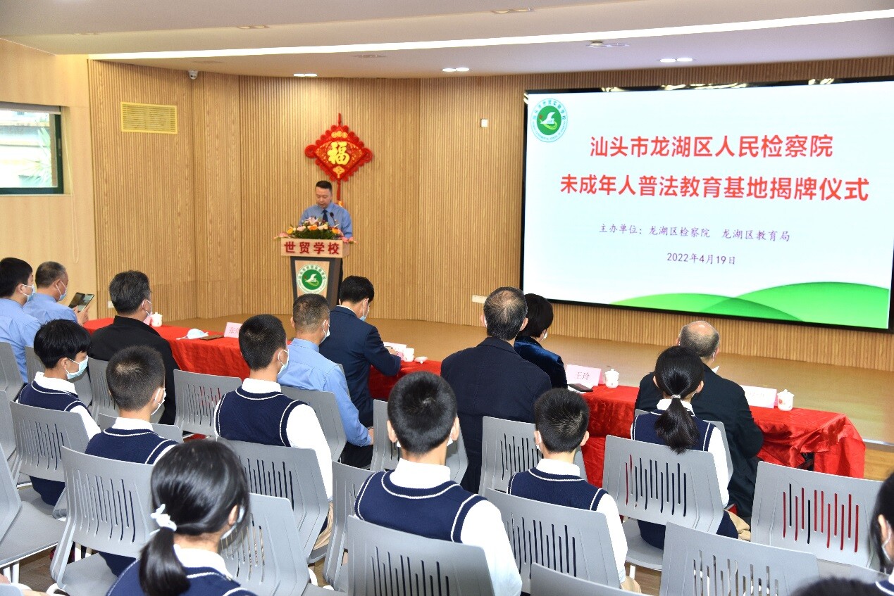 為全面加強新時期未成年人法治教育,深入開展法治進校園工作,4月19日,龍湖區(qū)在世貿(mào)實驗學校舉行“汕頭市龍湖區(qū)人民檢察院未成年人普法教育基地”揭牌儀式。龍湖區(qū)分管領導,區(qū)檢察院、區(qū)教育局主要領導及相關同志,世貿(mào)實驗學校師生代表參加了揭牌儀式。