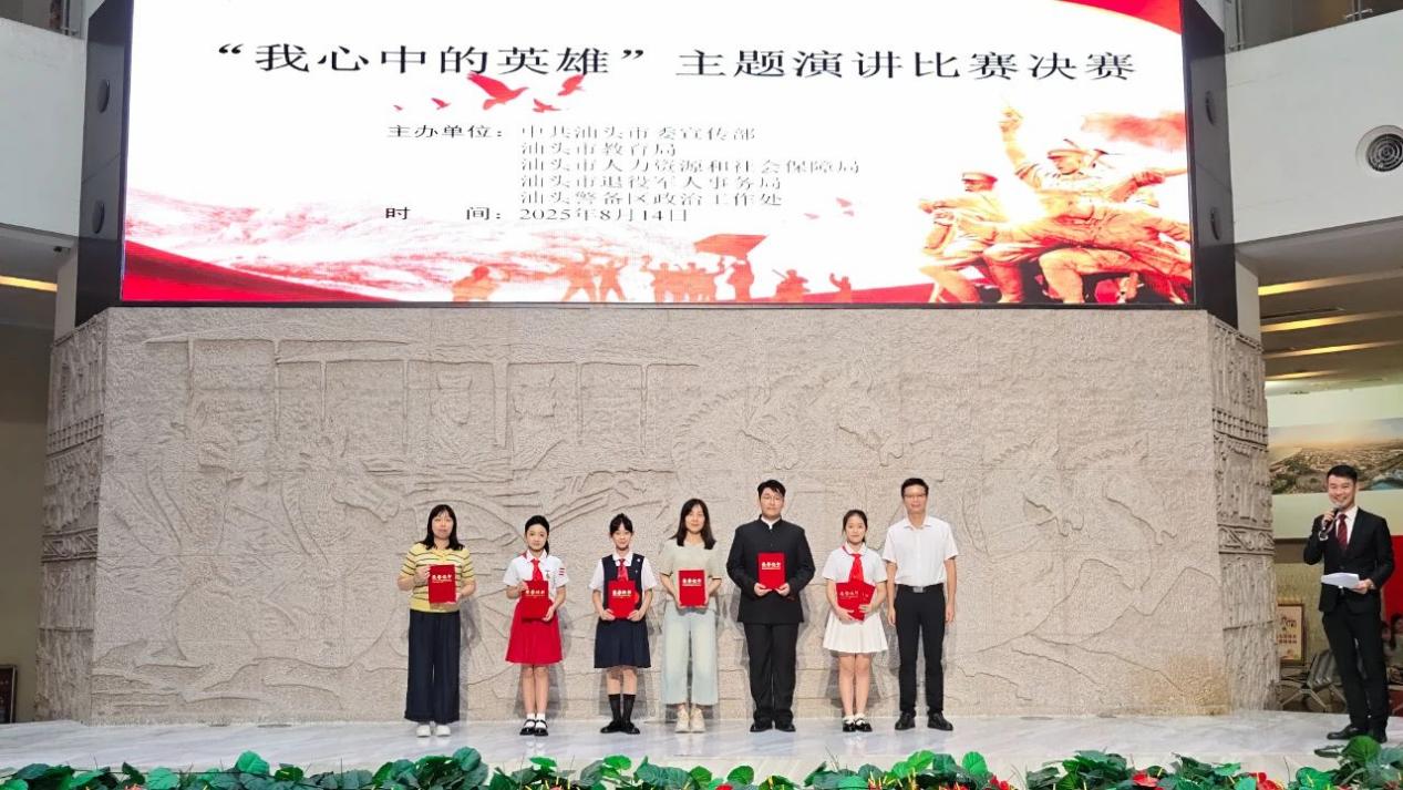 為紀念中國人民抗日戰(zhàn)爭暨世界反法西斯戰(zhàn)爭勝利80周年,2025年8月14日下午,中共汕頭市委宣傳部、市教育局、市人力資源和社會保障局、市退役軍人事務局、汕頭警備區(qū)政治工作處聯(lián)合舉辦“我心中的英雄”主題演講比賽。我校師生表現(xiàn)出色,取得了優(yōu)異的成績,紀藝晗同學榮獲中學組金獎(第一名)、“最佳風采獎”,陳書琳老師榮獲“優(yōu)秀指導老師獎”,展現(xiàn)了翠英中學師生卓越的綜合素養(yǎng)與精神風貌!