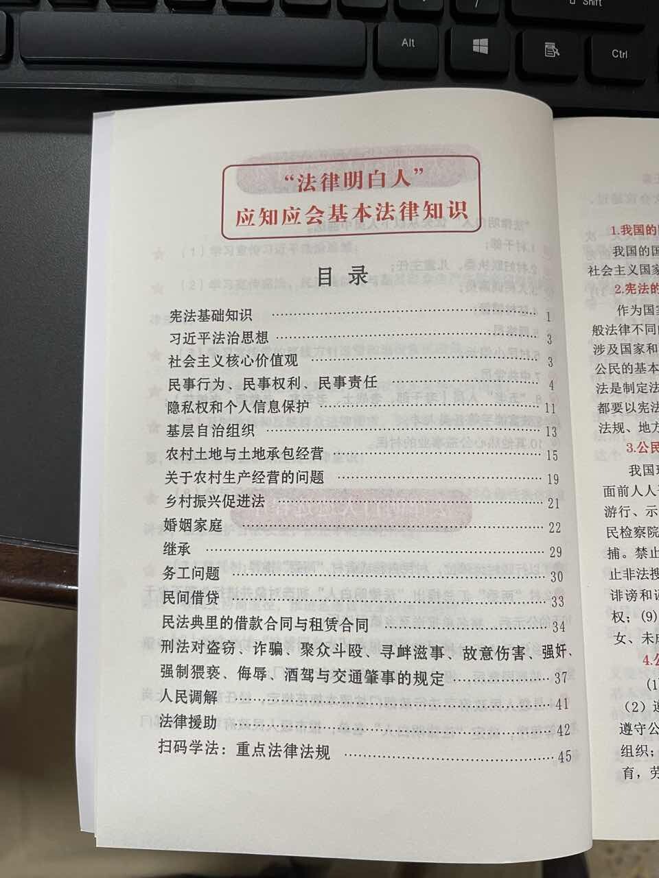 為更好地加強(qiáng)“法律明白人”的法治實(shí)踐能力和法治素養(yǎng),區(qū)普法辦、區(qū)司法局印制了一批“法律明白人”學(xué)習(xí)手冊,學(xué)習(xí)手冊編入“法律明白人”應(yīng)知應(yīng)會基本法律知識(其中包括憲法基礎(chǔ)知識、習(xí)近平法治思想、基層組織自治組織、農(nóng)村土地與土地承包經(jīng)營、鄉(xiāng)村振興促進(jìn)法、婚姻家庭、務(wù)工問題、民法典里的借款合同與租賃合同、法律援助、人民調(diào)解等)、重點(diǎn)法規(guī)掃碼學(xué)法和基礎(chǔ)法律文書書寫范文,集法律知識與筆記于一體,方便于各“法律明白人”更好地時時學(xué)習(xí)法律知識與記錄,不斷的提高法治素養(yǎng)。