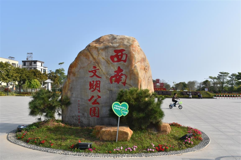西南文明公園地處鄉村地段,是一個沒有圍墻的開放式公園,對村民常年免費開放。公園環境整潔優美,設備安全衛生。公園內法治文化景觀設施規模適當,布局合理,法治文化主題突出,普法景觀設施占地約12000余平方米。