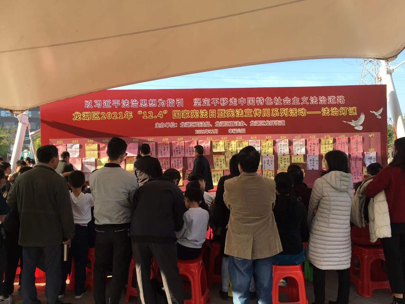 二是龍湖區(qū)舉行2021年“12·4”國家憲法日憲法宣傳燈謎競猜活動。2021年12月4日下午,龍湖區(qū)司法局、普法辦聯(lián)合龍祥街道、龍湖區(qū)燈謎協(xié)會在龍湖區(qū)幸福公園舉行了一場融知識性與趣味性于一體的“12·4”國家憲法日憲法法治宣傳燈謎競猜活動”。
