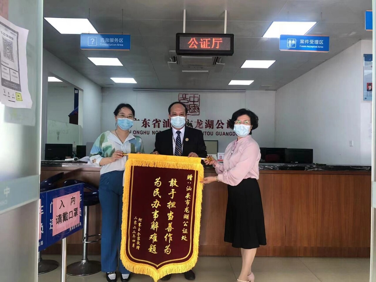2022年4月25日下午,當事人王女士專程來到汕頭市龍湖公證處,將一面寫著“敢于擔當善作為 為民辦事解難題”的錦旗送到公證員手中,對龍湖公證處為民解憂的態度、優質高效熱情的服務表示誠摯的感謝。