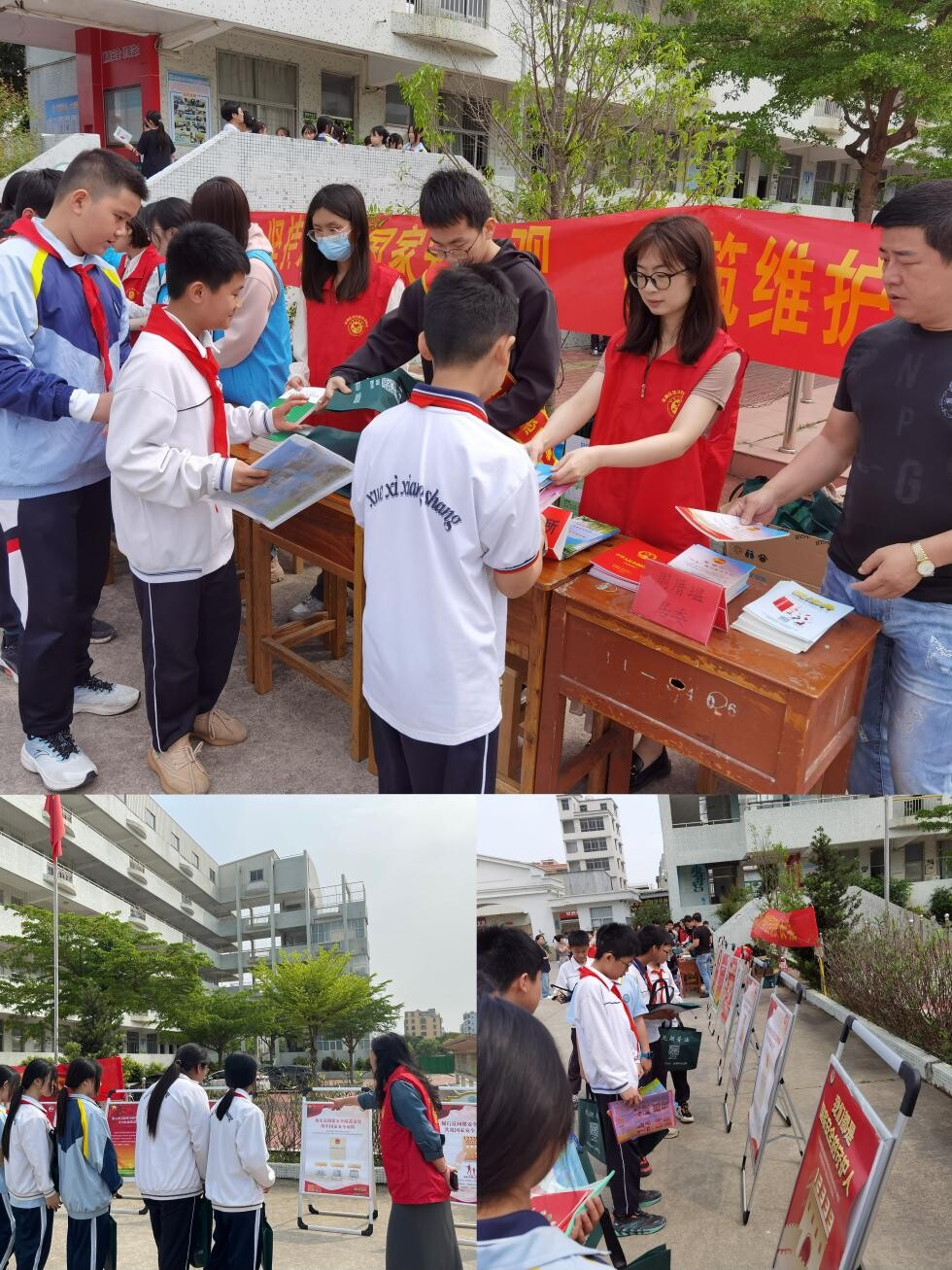 現(xiàn)場(chǎng)普法活動(dòng)在學(xué)校大操場(chǎng)舉行,通過(guò)擺放宣傳展板、發(fā)放法治宣傳資料、懸掛橫幅等形式,向同學(xué)們講解憲法、民法典、國(guó)家安全教育、預(yù)防未成年犯罪等相關(guān)法律法規(guī)知識(shí)。普法志愿者向?qū)W生們發(fā)放憲法、民法典、圖釋未成年人保護(hù)法、國(guó)家安全宣傳手冊(cè)、普法購(gòu)物袋等法治宣傳資料和禮品,教育引導(dǎo)同學(xué)們樹(shù)立正確的法治觀念。在“國(guó)家安全”展板前,普法志愿者還向同學(xué)們宣傳國(guó)家安全的重要性,樹(shù)牢“國(guó)家安全,人人有責(zé)”的防線(xiàn)意識(shí)。