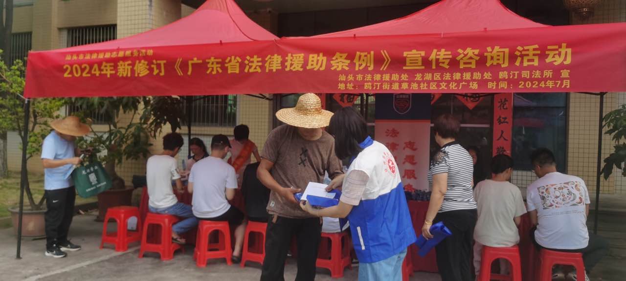 為貫徹宣傳新修訂的《廣東省法律援助條例》,提高法律援助的知曉率,充分發揮法律援助服務民生的職能作用,切實為群眾提供法治保障,2024年7月10日上午,汕頭市法律援助處、龍湖區法律援助處及鷗汀司法所的法援志愿者走進鷗汀街道草池社區文化廣場開展2024年新修訂《廣東省法律援助條例》宣傳咨詢專場活動。