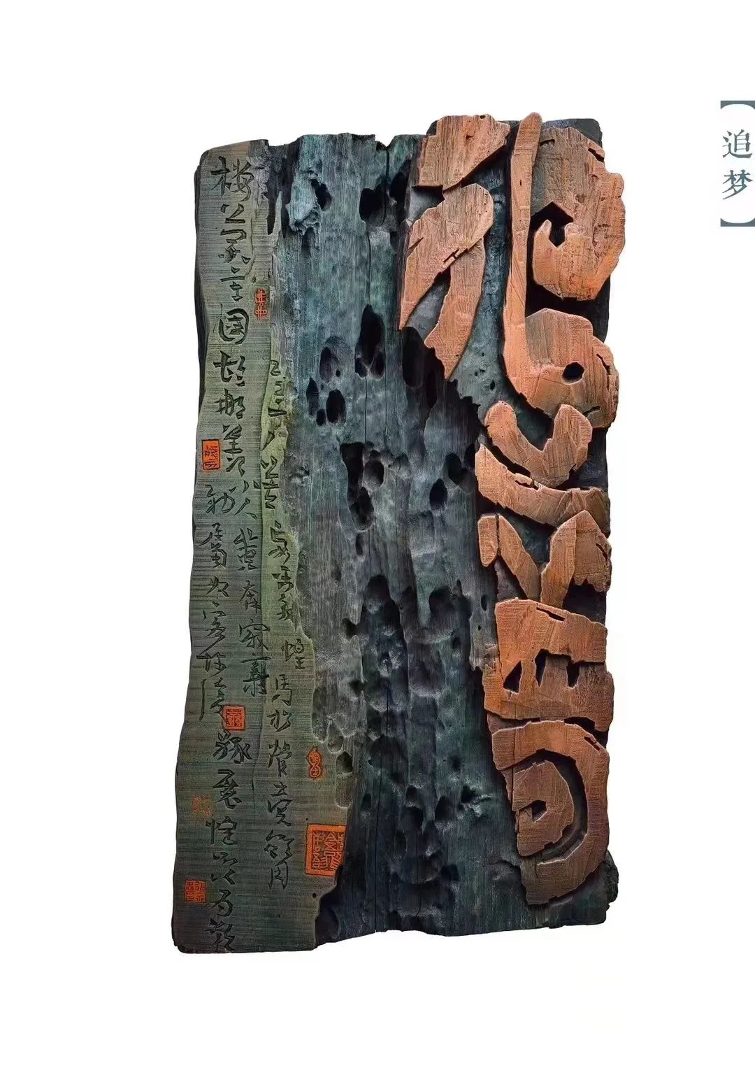 張永忠以木為媒,“刀”耕不輟,用非遺傳承技藝精雕細(xì)琢,融詩語于木頭,賦華章于匠心。他創(chuàng)作的《追夢》是一塊天然的老船木,整件作品融漢字的書法美、雕刻的形式美、材料的肌理美、色彩的裝飾美等多種藝術(shù)美于一體。“追夢”二字適當(dāng)?shù)目鋸堊冃危峙c底板呈現(xiàn)凹凸有致,木質(zhì)紋理清晰可見,流暢的線條,傳神的筆韻,令人嘆為觀止,既是一款精致的藝術(shù)擺件,更是一件不可多得的收藏佳品。