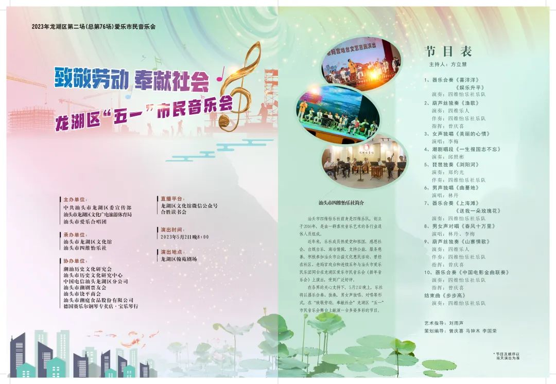 滿懷豪情歌盛世,金曲飛揚慶五一。5月2日晚,龍湖翰苑劇場座無虛席,市民觀眾匯聚一堂,欣賞由汕頭市四維怡樂社獻演的2023 年第5場愛樂市民音樂會。