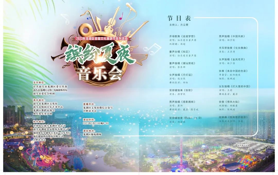 為配合全域旅游示范區(qū)創(chuàng)建工作,帶動(dòng)文化旅游經(jīng)濟(jì)業(yè)態(tài)發(fā)展,龍湖區(qū)自5月19日開(kāi)始舉辦為期一周的龍湖區(qū)首屆文化旅游節(jié),大力宣傳幸福龍湖、大美龍湖,充分擦亮龍湖文化旅游品牌,促進(jìn)龍湖區(qū)文旅深度融合發(fā)展。5月21日晚8:00,愛(ài)樂(lè)市民音樂(lè)會(huì)《繽紛夏夜》將在翰苑劇場(chǎng)上演。屆時(shí),音樂(lè)會(huì)由龍湖區(qū)文化館微信公號(hào)直播間和合勝讀書(shū)會(huì)直播間進(jìn)行直播。