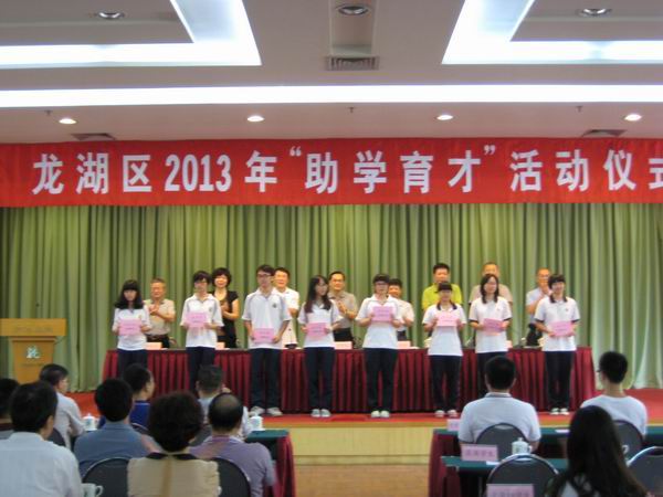 8月27日,龍湖區舉行“龍湖區2013年‘助學育才’活動儀式”,向全區318名貧困家庭的學子發放助學金,并向在今年高考、中考中取得優異成績的73名優秀學子頒發獎學金。區各套班子領導和龍湖(香港)海外聯誼會嘉賓親自為學子們頒發助(獎)學金。