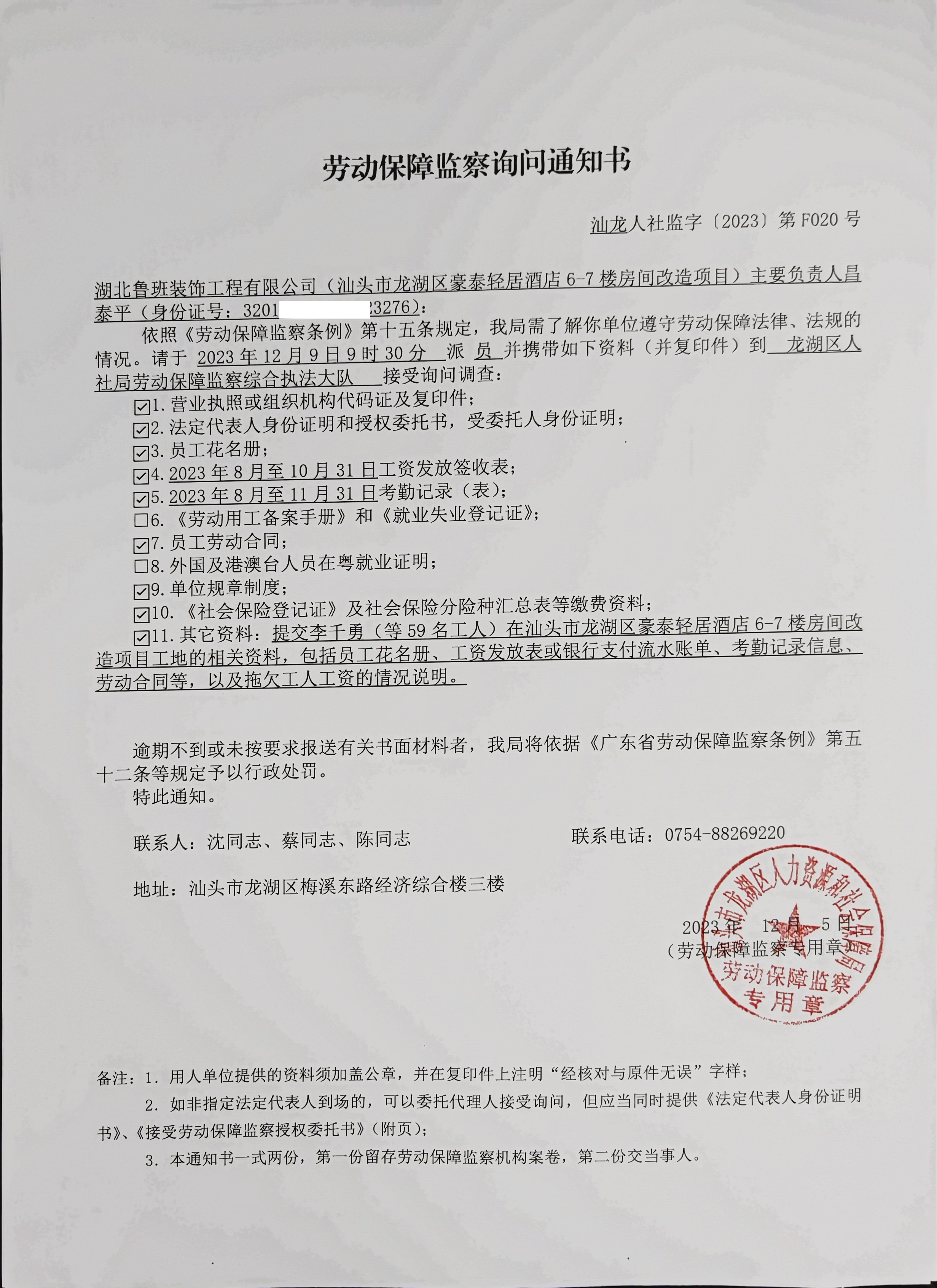 涉嫌欠薪基本情況:湖北魯班裝飾工程有限公司在汕頭市龍湖區豪泰輕居酒店6-7樓房間改造項目未落實用工實名制管理,未向我局提供相關的用工資料,如:勞動合同、考勤記錄、工資發放簽收表等憑證,且涉嫌拖欠李千勇等59名工人約364955元的農民工勞動報酬 。