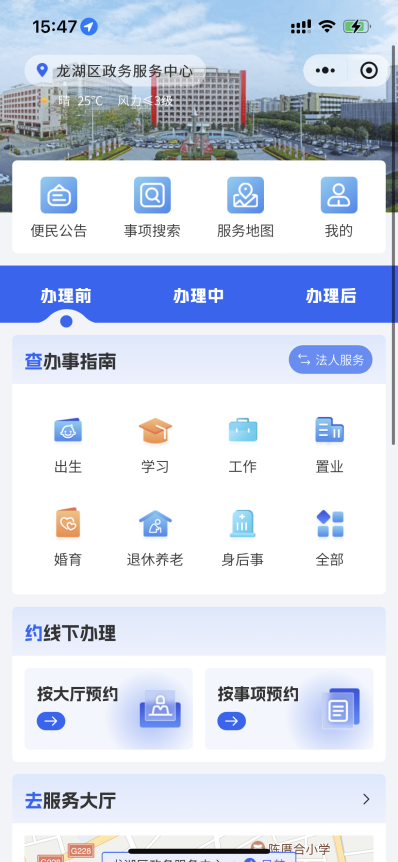 “龍易辦服務”小程序推動政務服務與數字技術深度融合,將線下窗口大廳分布、排隊實況、預約辦理、幫辦代辦、免費打印復印、辦件進度查詢等業務服務與線上功能融合,實現“指尖查”、“掌上辦”。